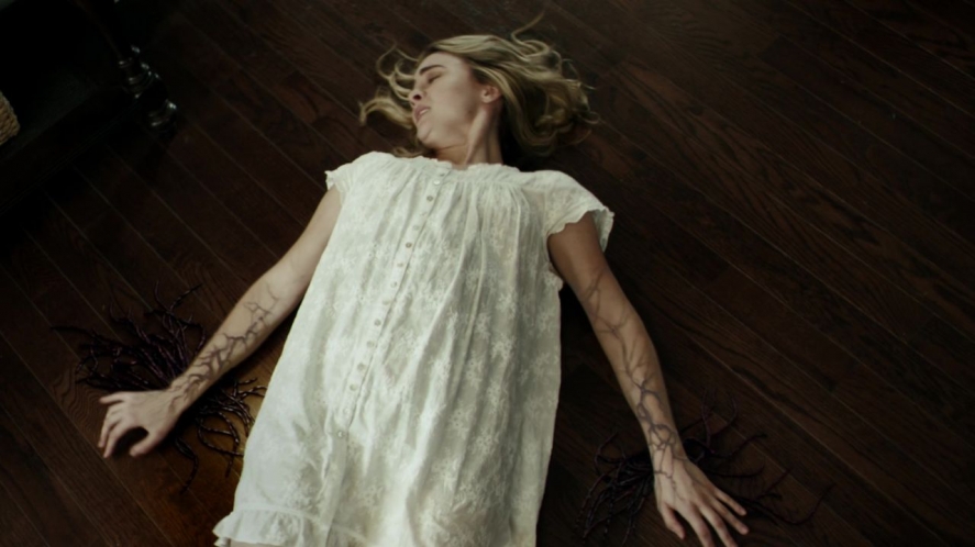 Yet for all Casey’s besieged body, the demon’s form is also revealing. He becomes ever more disgusting and tattered over the course of the episode. It isn’t just that he’s wearing her down, eroding her resistance. It seems that she is also wearing him down, through that very resistance. Watching the two of them, we the viewer hope that the demon’s becoming desperate. Where cajoling has failed, when threats don’t work, he attacks the people around Casey, including a nurse whose cross necklace swings as the demon chokes her. See what you made me do? he berates Casey. He tells her the power to end the nurse’s pain is hers, that all she has to do is say yes. He promises a release from pain, if she’ll only give in.